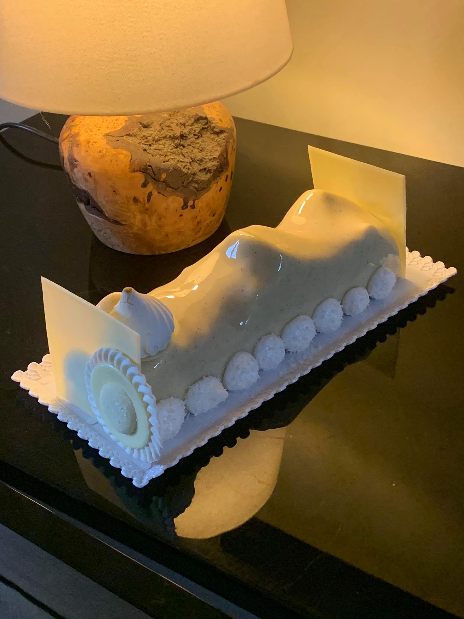 Biscuit fondant vanille – streuzel vanille – crémeux vanille – caramel noix de cajou – mousse diplomate vanille