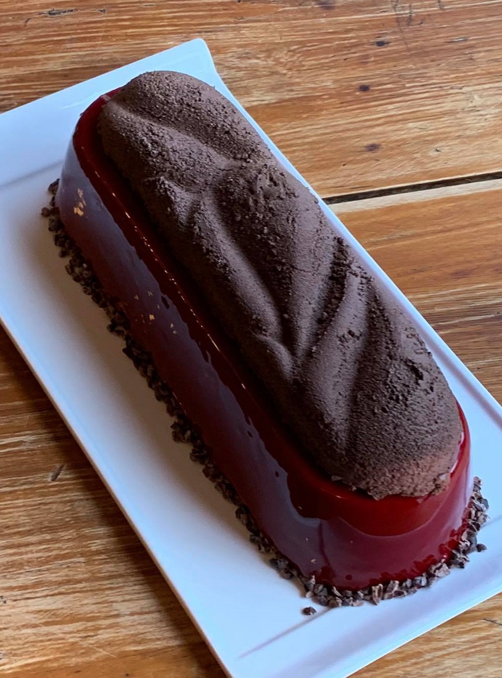 Croustillant chocolat – biscuit chocolat – compotée de griottes – crémeux chocolat griottes – mousse chocolat griottes