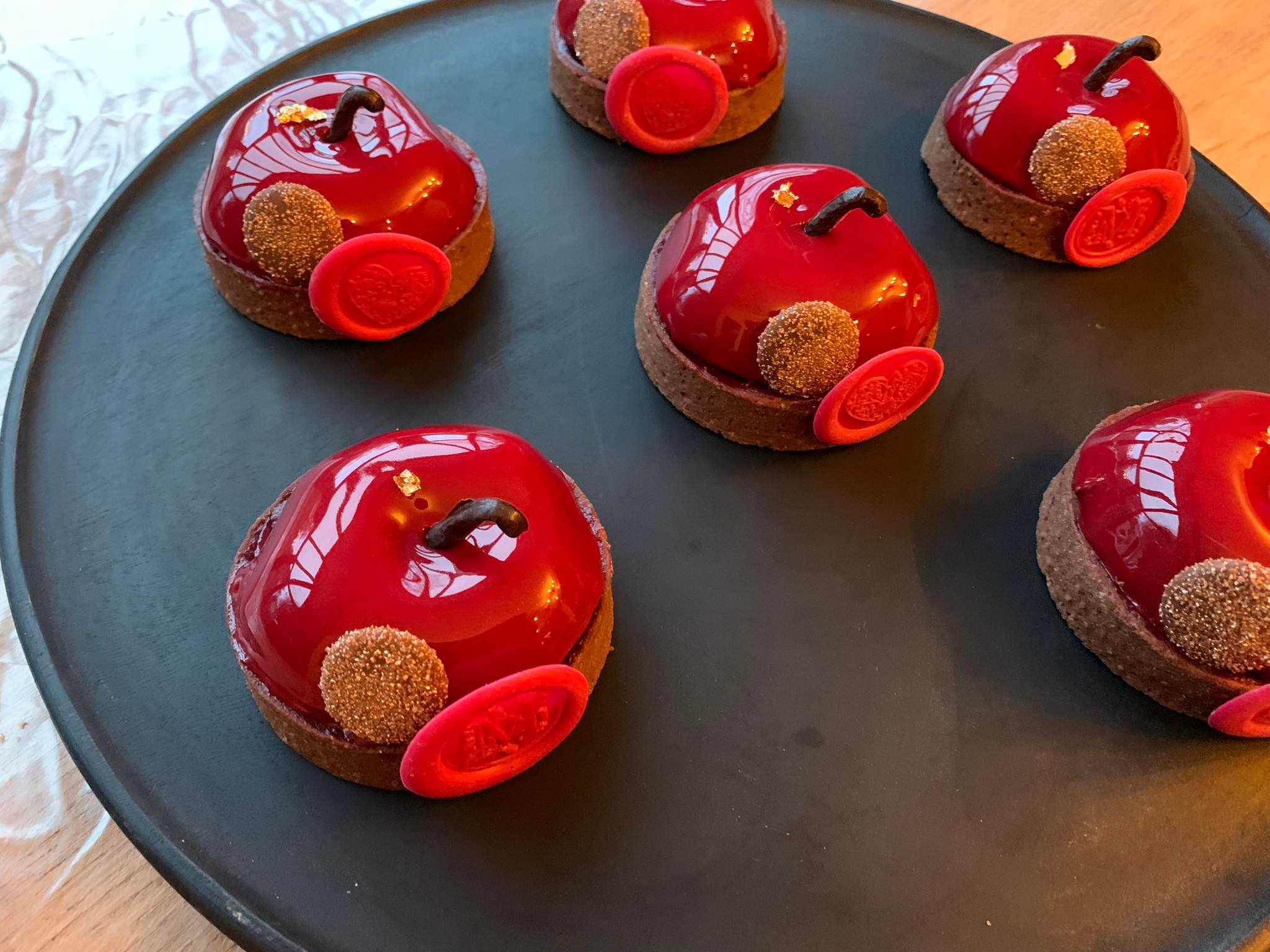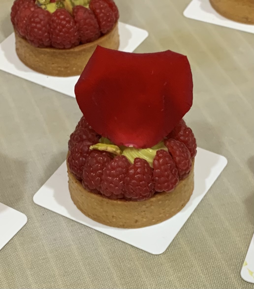 Pate sablée vanille – crème pistache – confit framboises – namelaka pistache – pistaches caramelisées